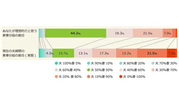 家事については、マクロミルが行なった「共働き夫婦の家事分担に関する調査(2016年9月実施)」の調査が面白い。共働き夫婦の家事分担の理想は「夫婦で50%・50%」だというが、現実は「夫10%・妻90%」が最多となっている。 若い世代ほど夫の家事参加率が上がってきているとはいうものの、共働き妻の3人に1人は不満を抱いているようだ。