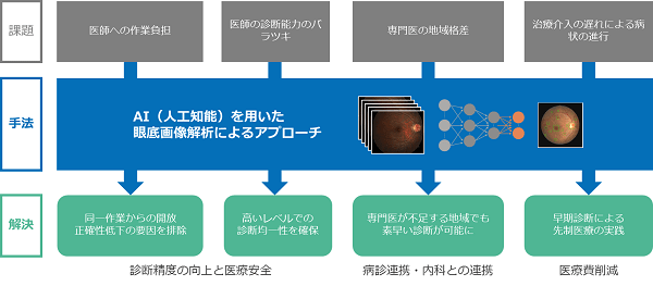 これらの課題に対して、AIを用いた眼底画像解析を行うことで、「医師の作業負担減、診断能力の均一化による診断精度の向上と医療安全の確保」、「病診連携や内科との連携」、「早期診断による先制医療の実践、医療費削減」などの解決が期待されている。
