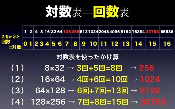 このような数表が対数表です。下の段のnが対数です。128の対数が7であるとは、128=2×2×2×2×2×2×2のように128は2を7回かけた数であることを表しています。