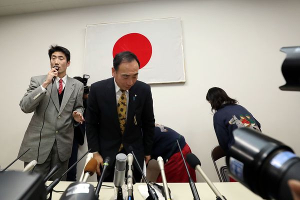 記者会見を終え、頭を下げて退室する学校法人「森友学園」の籠池泰典理事長(中央)。左は長男の籠池佳茂氏(2017年3月10日、写真:日刊スポーツ/アフロ)