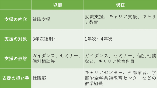 変化の転換点は、2000年頃であるが、現時点に近くなればなるほど、多くの大学が「変化後」の取り組みに乗り出すようになり、支援そのものが分厚くなっていった。