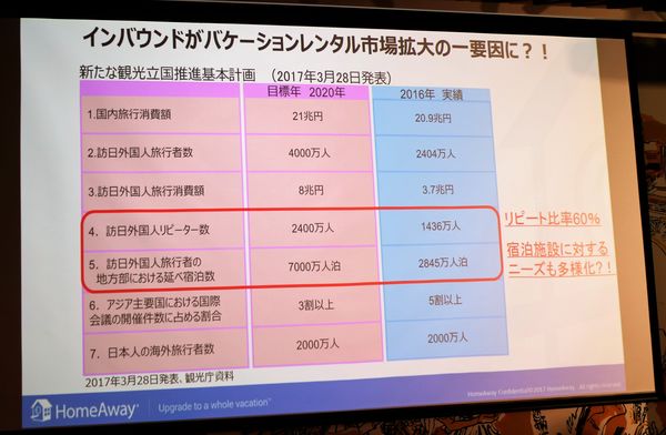 HomeAway日本支社長の木村奈津子氏によると、訪日外国人のリピート比率は60%と高く、東京、大阪、京都など主要観光大都市でのホテル利用者の「次は日本の自然や歴史を体験したい」というニーズを地方に求めると予測している。