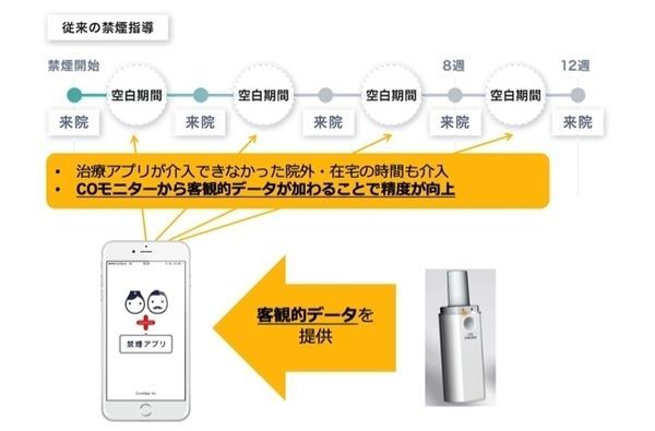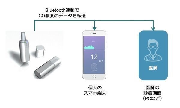 患者個人がポータブル呼気CO濃度測定器を持つことで、診察時(禁煙外来ではおおよそ月1回)だけでなく毎日測定でき、日々の治療の成果がより高い頻度で可視化されるようになる。