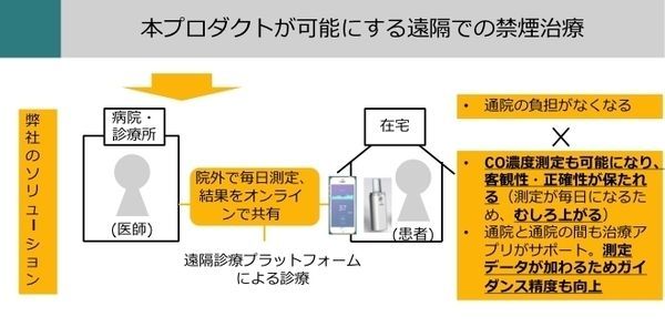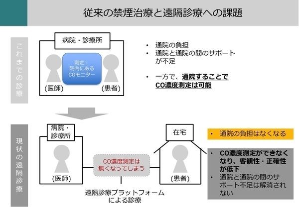 近年、政府の未来投資会議や厚生労働省において、遠隔診療への保険適用の拡大が議論されており、禁煙治療もその対象の一つとして注目を集めている。しかし、現在の保険適用の条件*1である呼気一酸化炭素(CO)濃度測定は遠隔で行えないため、測定のためには通院しなければならないという矛盾が生じている。