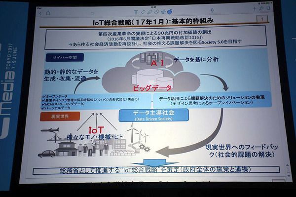 9日に行われた基調講演では、総務省情報通信国際戦略局情報通信政策課課長 小笠原陽一氏が「データ主導社会の実現に向けて」と題した基調講演を行った。その講演の中で「IoT総合戦略」が語られたので紹介しよう。
