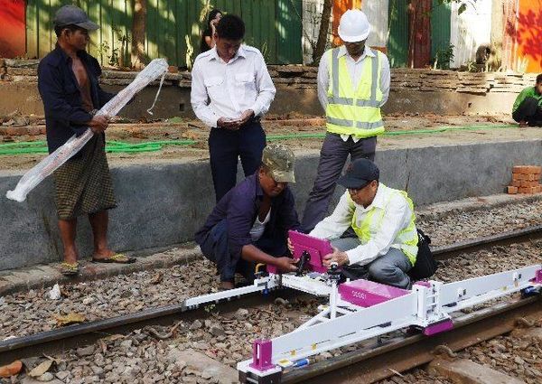 朝8時半過ぎ、ダウンタウンにほど近いシャンラン駅からヤンゴン中央駅方面に向かう環状鉄道のレールの上を、白とピンクに塗られた機械が滑るように動き始めた。手押し棒をそっと押す男性を取り囲むように、数人が歩調を合わせてゆっくりと歩く。