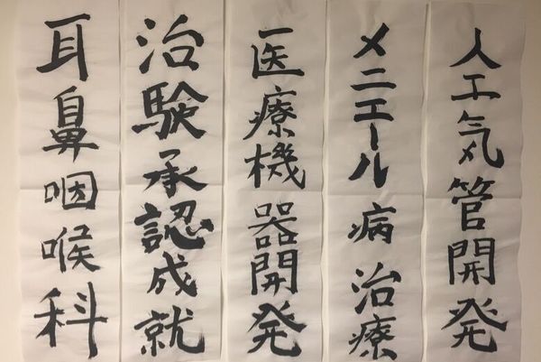 林社長による2016年年始の書き初め。「メニエール病治療」と「人工気管開発」は治験を伴う開発案件。