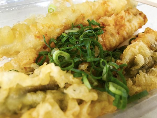 アナゴの天ぷら。大阪府泉南市内、岡田浦漁協が開催する「日曜青空朝市」にて。当地では古くからアナゴを天ぷらや蒲焼などで食べてきた。