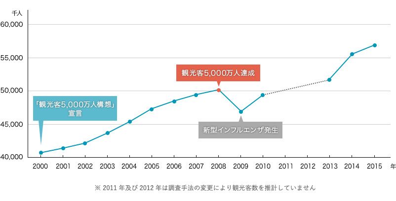 世界に誇れる日本の観光地としても有名で、年間の観光客数がまだ4,000万人だった2000年に「観光客5,000万人構想」を立ち上げ、目標より2年早い2008年に5,000万人を達成しました。