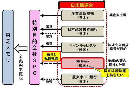東芝の取締役会は6月21日、産業革新機構を中心とする「第1次日米韓連合」に、東芝メモリ買収の優先交渉権を与えた。「第1次日米韓連合」は、特別目的会社(SPC:Special Purpose Company)を設立し、このSPCが東芝メモリを2兆円で買収する計画だった(図1)。