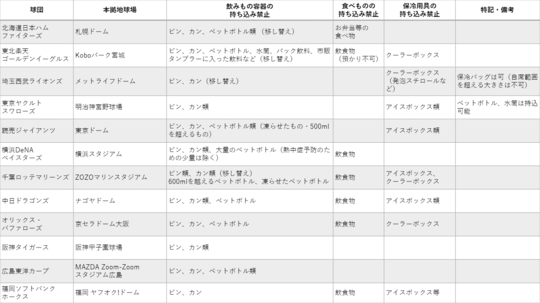 プロ野球の各球団の本拠地球場がホームページにスタジアムルールやお願いなどとして掲げている、飲食関連物の持ち込みについての記述を表にまとめた。