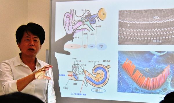 都内で耳の仕組みを説明するDCCの國司哲次社長