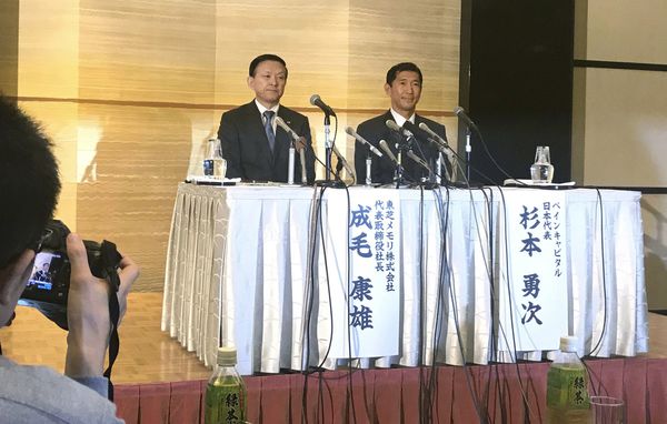 会見する成毛・東芝メモリ社長と杉本・ベインキャピタル日本代表(2017年10月13日、写真:AP/アフロ)