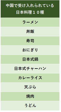 下の表は中国のウェブサイトで紹介されている「中国で受け入れられている日本料理10種」です。筆者自身の感覚からみても順当な選出だと思います。