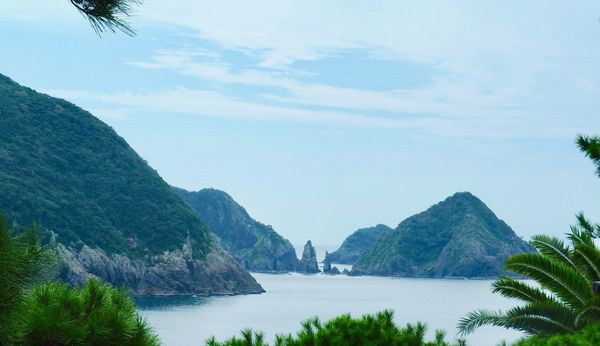 坊津はリアス式海外で国指定名勝でもある。写真向こうに見える二本のそびえ立つ巨岩は双剣石。江戸時代、歌川広重に画題として用いられもした