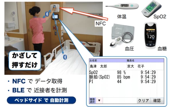 黒田 医療現場のタスクを減らし、診療や看護のためのリソースを十分確保するための仕組みづくりです。IoTを利用した一事例として、京大病院で開発・導入したバイタルデータターミナル(VDT)が挙げられます。これは、看護師さんがベッドサイドにある装置にデバイスをかざして確認ボタンを押すだけで、その患者さんのデータを自動的に電子カルテに書き込むシステムです。患者さんのベッドサイドに居るということをコンテキストとして利用して、4W1H(いつ、どこで、誰が、何を、どのように)の情報を半自動計測・記録できるわけです。