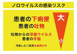 ノロウイルスの感染リスクは図の通り、大量のウイルスが含まれた患者の糞便、吐物であり、また、そのウイルスを少量含む生カキなどの貝類である。ただし、生カキは内臓を含めて生食するために感染するので、十分に加熱調理すれば感染することはない。