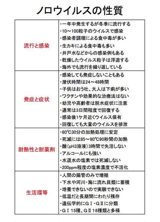 ノロウイルスの性質。「GI」「GII」は、ヒトの感染症や食中毒から検出される主なノロウイルスの遺伝学的分類。ヒトに感染するものとしては他にGIVがある。またGIIIはウシやヒツジ、GVはネズミに感染する。