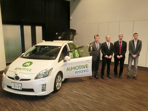 プリウスをベースとしたテスト車両の前で写真撮影に対応するAimotiveと菱洋エレクトロの関係者(筆者撮影、以下同)