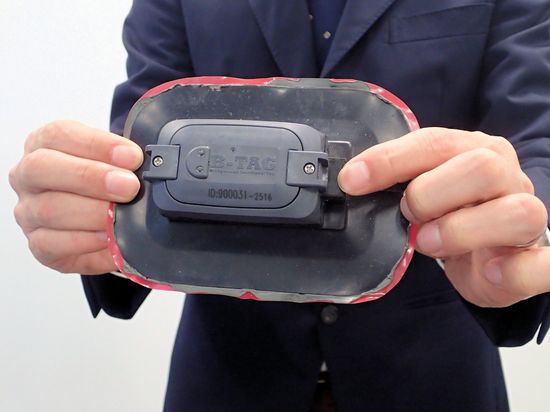 「B-TAG」のセンサー。タイヤの内側側面に取り付ける。センサーの単価は数万円