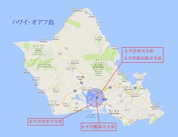 おそらく北朝鮮軍がハワイにミサイルを撃つ場合、北朝鮮に睨みを効かせているアメリカ太平洋軍の指揮命令系統を混乱に陥れるために、オアフ島の真珠湾にあるアメリカ太平洋艦隊司令部を目標に設定するであろう。なぜならば、太平洋艦隊司令部を中心として3~4キロメートル以内にアメリカ太平洋軍司令部、アメリカ太平洋海兵隊司令部、アメリカ太平洋空軍司令部が位置しているため、アメリカによる北朝鮮攻撃の先鋒部隊の上級指揮統制系統を灰燼に帰すことができるからだ(下の地図)。
