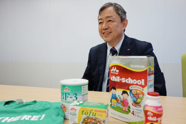 海外向け商品を前にする森永乳業 執行役員 海外事業部長の椎野工氏