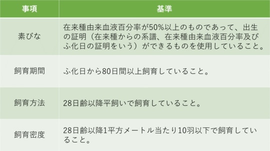 市場を占めている鶏のほとんどは外国種だが、それに対し日本鶏の血統が50%以上占めているのが「地鶏」で、日本農林規格(JAS)で定めた4つの条件を満たしたものをいう(下の表)。ただし、これは商業上の呼称で、品種としての地鶏とは別物だ。名古屋コーチンや比内地鶏はこの商用地鶏だ。