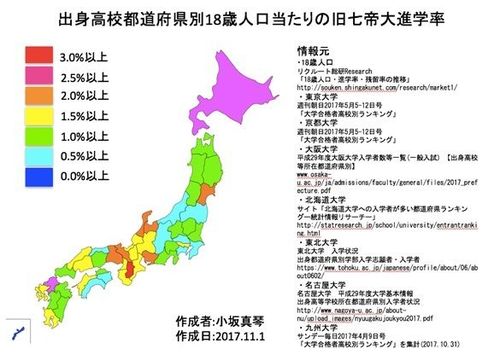 後者について分析をするために、旧七帝大に範囲を広げ、進学率を調べてみた。この記事で論じるデータは、都道府県の18歳人口で、都道府県内の高校から旧七帝大に合格した人数を割った値である(図1)。
