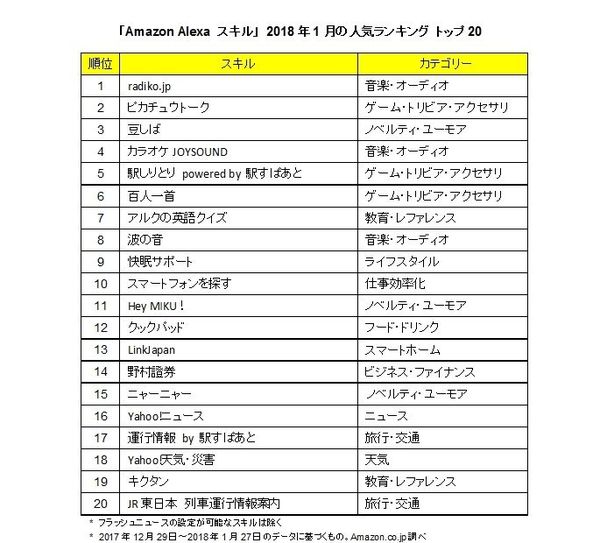 2月20日、Amazon.co.jp(以下、Amazon)は同社のスマートスピーカー、「Amazon Echo」シリーズで利用できる「Alexaスキル」の2018年1月の人気ランキングを発表した。