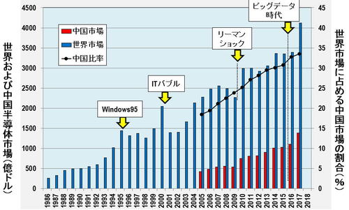 半導体の世界市場に占める中国市場の割合を見ても、中国半導体市場の統計データが入手可能な2005年に18.5%だったが、2017年には33.5%を占めるまでになり、今後中国が占める割合はさらに大きくなりそうな勢いである(図2)。