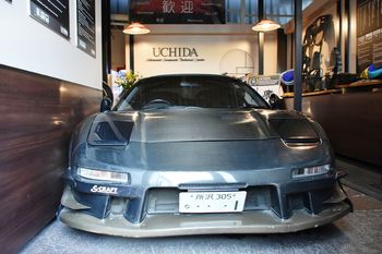 2000年にウチダ社長の内田敏一さんが有志の従業員と就業時間後にカーボン製ボディを製作し実装したNSX。