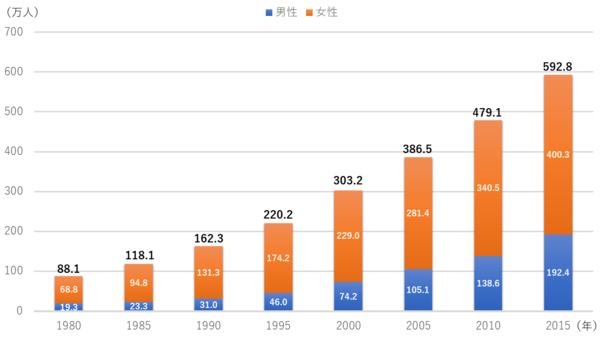 2017年に公表された内閣府の調査によると、65歳以上の一人暮らしの高齢者は1980年では88万人(男性約19万人、女性約69万人)であったが、2015年には592万人(男性約192万人、女性約400万人)と、35年で6.7倍。高齢者がいる世帯の4世帯に1世帯が「高齢者の独居世帯」*1となり、今後も増え続けていくことは避けられない。