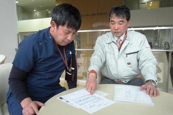 埼玉医科大学にて打ち合わせをする埼玉医科大学消化器外科副診療部長の合川公康教授(左)とリソテックジャパン取締役の関口淳さん