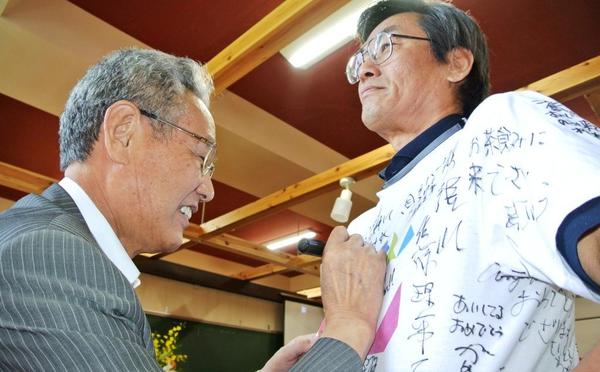高畠町で行われた熱中小学校の第1回卒業式。卒業生の1人、山田賢一さん(右)の記念Tシャツにお祝いの言葉を書く寒河江信町長。