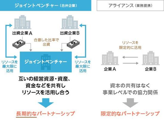 また、買収・合併(M&A)と提携(アライアンス)の中間に位置する形態と言えるため、双方の「良いところ取り」を期待できる。買収や合併時ほど企業間の摩擦を気にする必要がないことに加え、ある程度のコストを伴うことにより単なる業務提携よりも高い成果を期待できる。