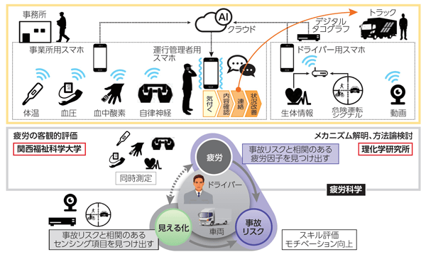 「SSCV」は、疲労科学に着目し、事故リスク低減を目指す安全運行支援技術である。運行するトラックに、ドライバーの生体情報、自律神経、脳波、目の瞳孔、車の挙動などのセンシング機器を設置し、そこから吸い上げたデータをAIが分析し、危険運転の予兆(疲労、眠気、注意散漫など)が出た段階でリアルタイムにドライバーや運行管理者にアラートを発し、事故を未然に防ぐ仕組みだ。