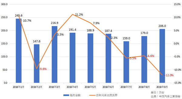 今年(2018年)の上半期(1~6月)まで、中国の自動車市場は安定成長していました。ところが、9月における中国の自動車販売台数は239.4万台で前年同期比11.6%減となりました。乗用車販売台数もここ3カ月連続で前年割れが続いています。9月は前年同期比12%減の206万台と落ち込み、単月としては2012年以来7年ぶりとなる下落幅となりました(いずれも中国汽車工業協会のデータより)。