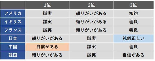 以下、「理想の男性」の資質ベスト3について、米・英・仏・日・中・韓の6カ国を比較してみよう(下の表)。