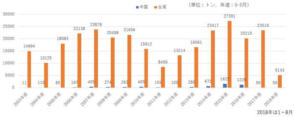財務省統計によれば2003年産の日本産りんごの対中輸出量は11トンだった。その後、日本産りんごの対中輸出は7年で405トン(2010年産)まで拡大する。