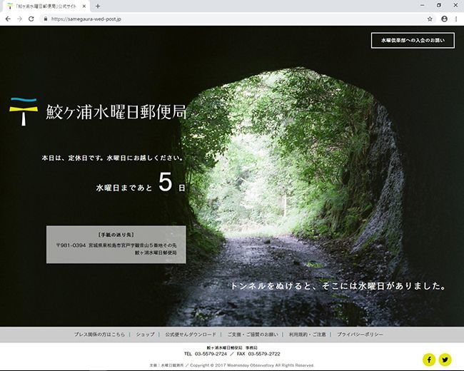 公式サイト(https://samegaura-wed-post.jp/)のトップページには、「鮫ヶ浦(さめがうら)水曜日郵便局」という大きなタイトルの下に、「本日は、定休日です。水曜日にお越しください。」とそっけない文章が書かれていた。後でわかったことだが、水曜日限定で開局するこの郵便局は、水曜日とそれ以外の日では、トップページの表示が変わる(2018年12月5日にプロジェクトが終了(閉局)したので、現在のWebページの表示は異なる)。が、それより何より、心臓の拍動が1つ飛んでしまうくらい印象的だったのは、PC画面いっぱいに表示されている背景の景色だった。