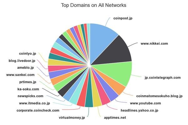 「仮想通貨」を含む記事のSNS上での言及量に関しては2位に「日経電子版」、6位に「ヤフー」がランク入りしているものの、1位の「コインポスト」、3位の「コインテレグラフ」含めその多くは仮想通貨特化型ニュースサイトになります。
