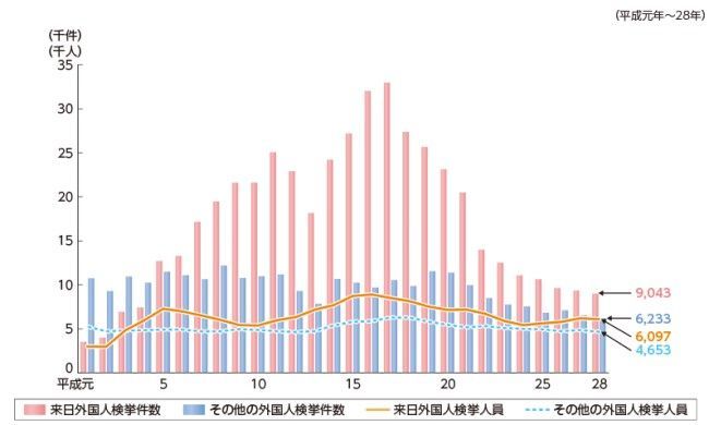 図1 外国人による刑法犯 検挙件数・検挙人数の推移(平成元年~28年)出典:法務省 平成29年版 犯罪白書 第4編/第9章/第2節/1