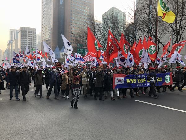 「太極旗部隊」と名乗るデモの行列がソウル市内を埋め尽くしていた様子は確かに壮観だった。人々を観察していると韓国軍OBや、中高年の男性や地方出身者が多い。いわゆる保守層、右派によるデモが太極旗部隊であるようだ。