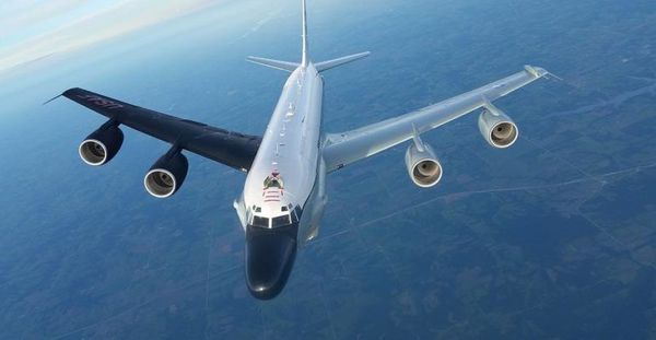 米空軍偵察機RC-135S コブラボール。計測機器の関係で片方の主翼が黒く塗装されている(写真:MDAA)
