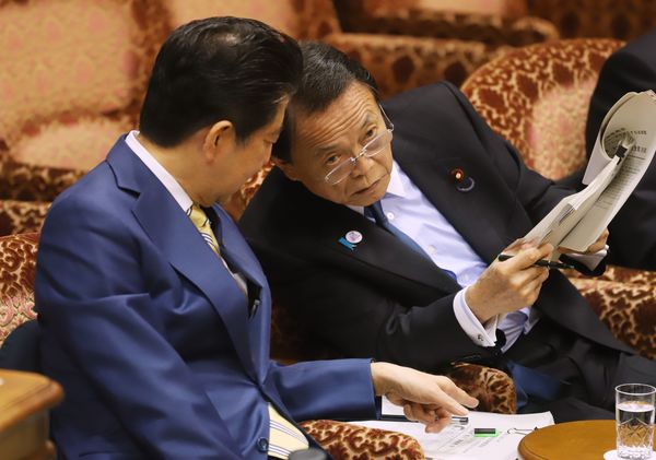 塚田一郎議員が「忖度した」と語った安倍晋三首相(左)と麻生太郎・副総理兼財務大臣。写真は3月14日、参議院予算委員会(写真:つのだよしお/アフロ)