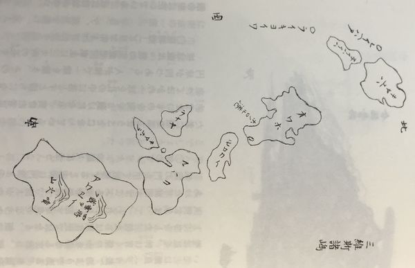 万延元年遣米使節団の一人、木村鉄太が描いたハワイ諸島の地図。当時、ハワイ諸島は「三維斯諸島(サンドイッチ諸島)」と呼ばれていた(高野和人著、『万延元年遣米使節航米記 肥後藩士 木村鉄太の世界一周記』より)