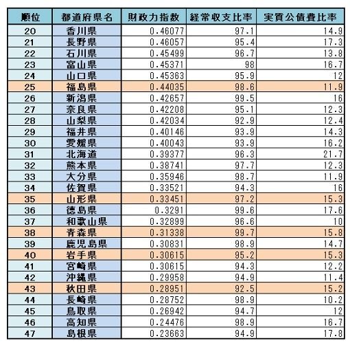確かに、東北の自治体は宮城県を除いては、もともと財政が豊かではないところが多いのが現状です。自治体の財政力を測る指標はいくつかありますが、以下の表は2007(平成19)年度の都道府県の財政力を、「財政力指数」を基準としてランキングしたものです。