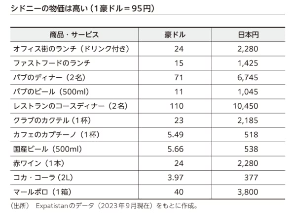 実際、私も取材時に実感したが、シドニーの物価は高かった。先にも触れているが、ランチのから揚げ定食は日本円で約2000円だったし、すき焼き定食は3000円、生ビールとラーメンで3000円を超えた。また、サンドイッチは700円、寿司ロールは600円、空港で売られているミネラルウォーターも400円ほどだった。