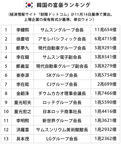 他にも、鄭夢九(チョン・モング)現代自動車グループ会長や、崔泰源(チェ・テウォン)SKグループ会長、具本茂(ク・ボンム)LGグループ会長が上位に入った。韓国の財閥の資産規模が1位、2位、3位、4位で、オーナー会長が富豪ランキングの上位を占めることは当然と言えば当然だろう。