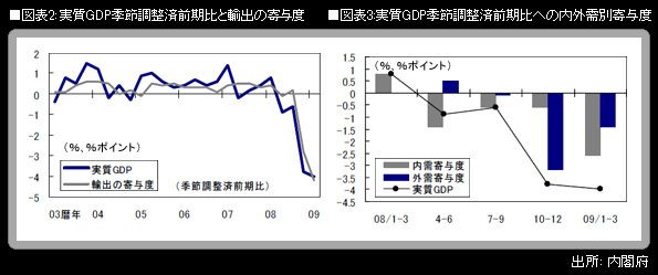 内閣府が20日に発表した今年1-3月期の四半期別GDP速報(QE)で、実質GDPは前期比▲4.0%(同年率▲15.2%)になった。1974年1-3月期に記録した前期比▲3.4%(同年率▲13.1%)よりも弱く、戦後最悪記録を更新。マイナス成長はこれで4四半期連続となる。内外需別の寄与度は、内需が▲2.6%ポイント、外需が▲1.4%ポイント。昨年10-12月期と比べると、内需のマイナス寄与が大きくなる一方、外需のマイナス寄与が小さくなった。「輸出急減ショック」から国内需要の急減へと、景気悪化の主役が変わりつつあることが示されている。実質GDPは、前年同期比では▲9.7%となった。
